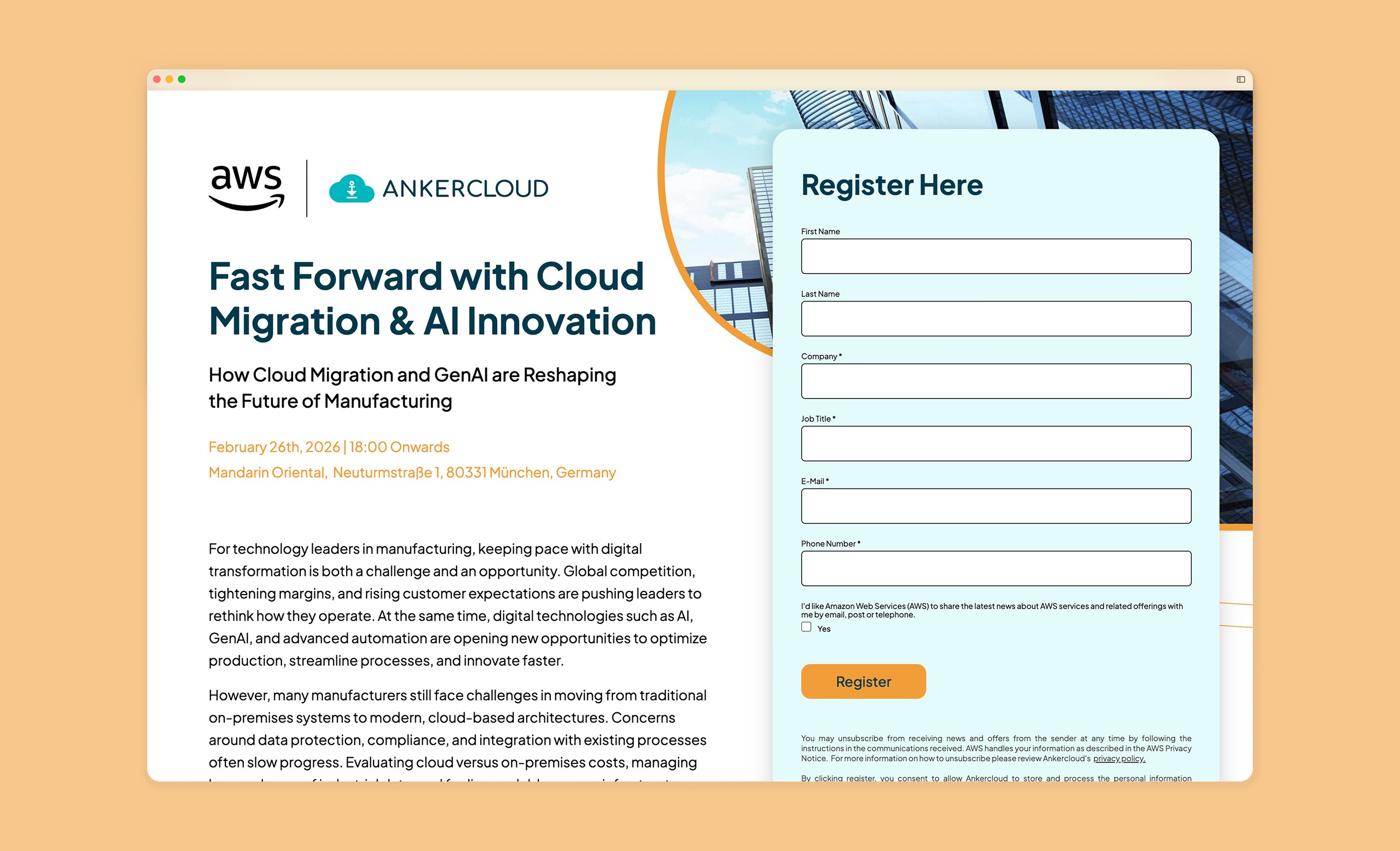 Stripped registration to name, email, company, and role. Removed redundant fields like address and phone by leveraging existing AWS partner account data.